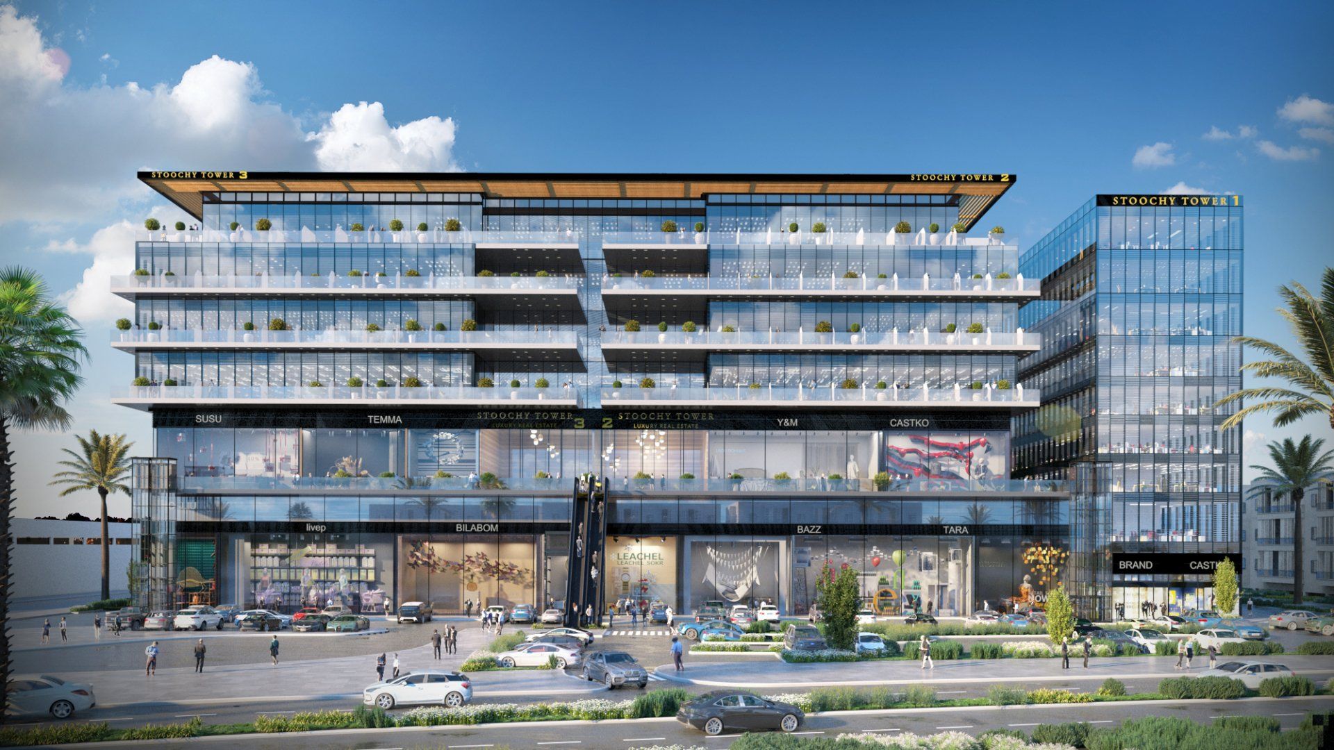 המבנה כולל קומת מסחר הכוללת מסעדות, בתי אוכל וחנויות וחניה בגג המבנה.